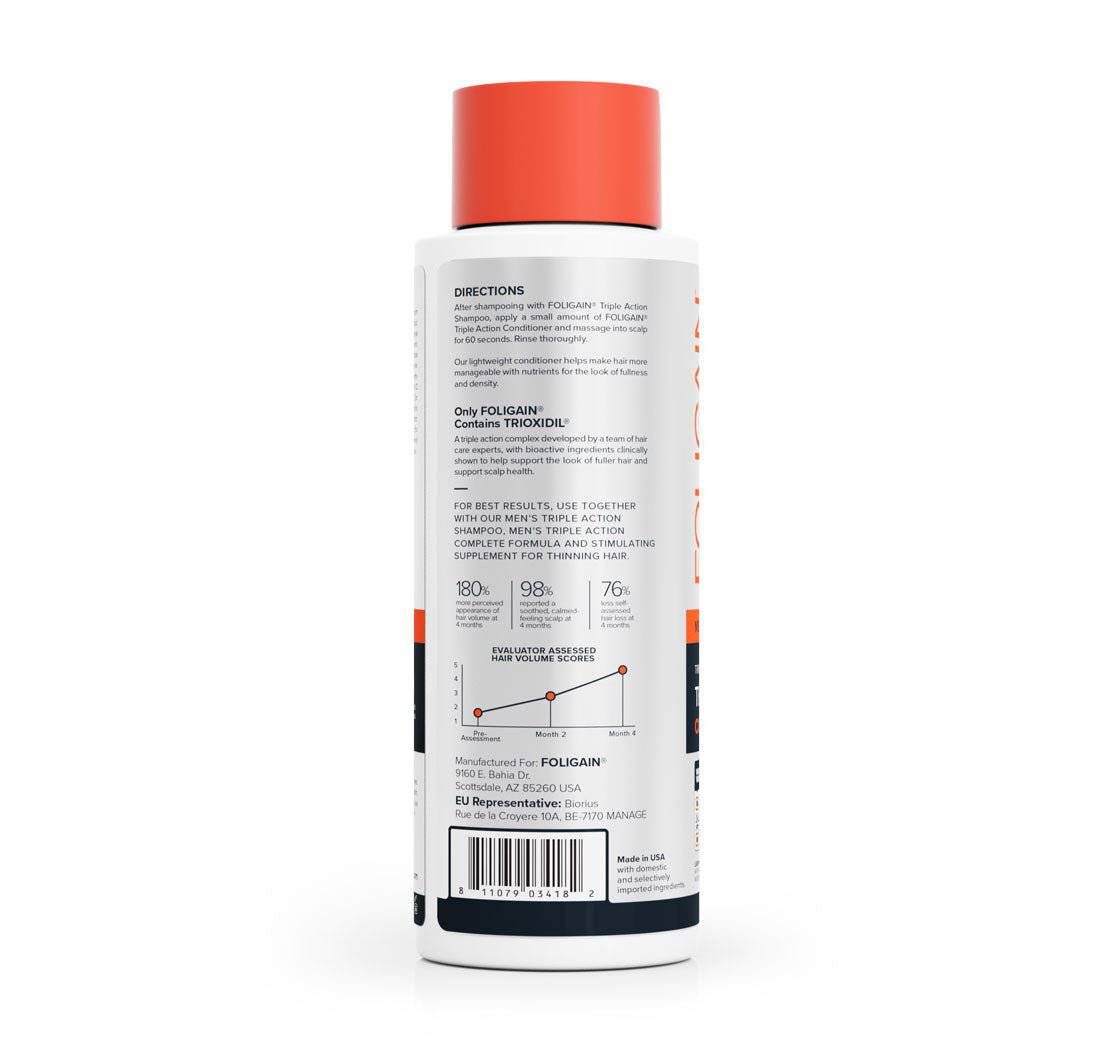 After shampooing with FOLIGAIN® Triple Action Shampoo, apply a small amount of FOLIGAIN® Triple Action Conditioner and massage into scalp for 60 seconds. Rinse thoroughly.