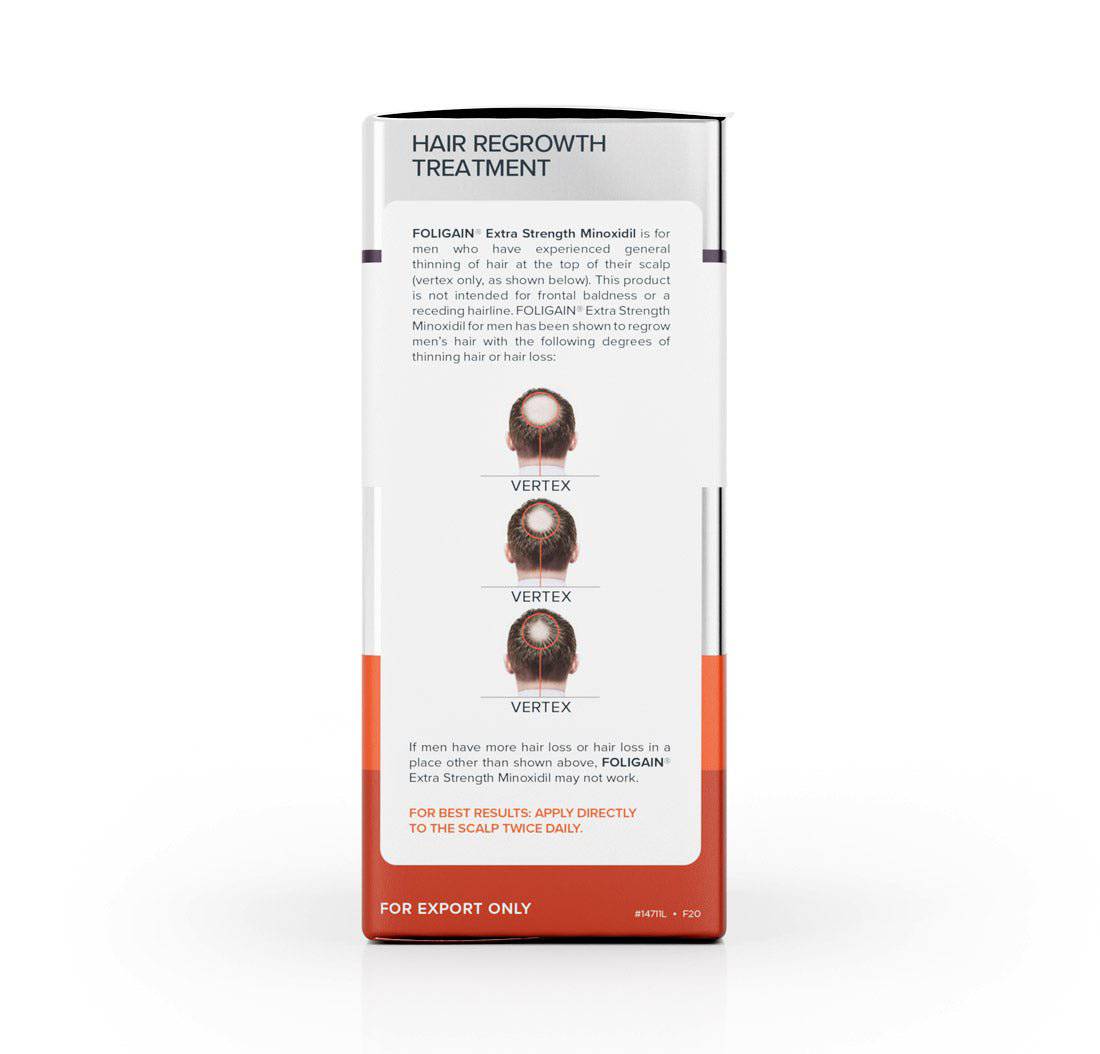 FOLIGAIN® Minoxidil 5% Hair Regrowth Treatment is for Men who have a general thinning of hair on the top of the scalp (vertex, as shown below). Our high-performance formula uses pure and potent 5% Minoxidil for a simple, painless, clinically proven answer to hair loss in men that works by awakening and revitalizing the scalp area—specifically the deadened hair follicles. It is clinically shown to help prevent hair loss and regrow hair in just a few months.